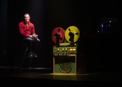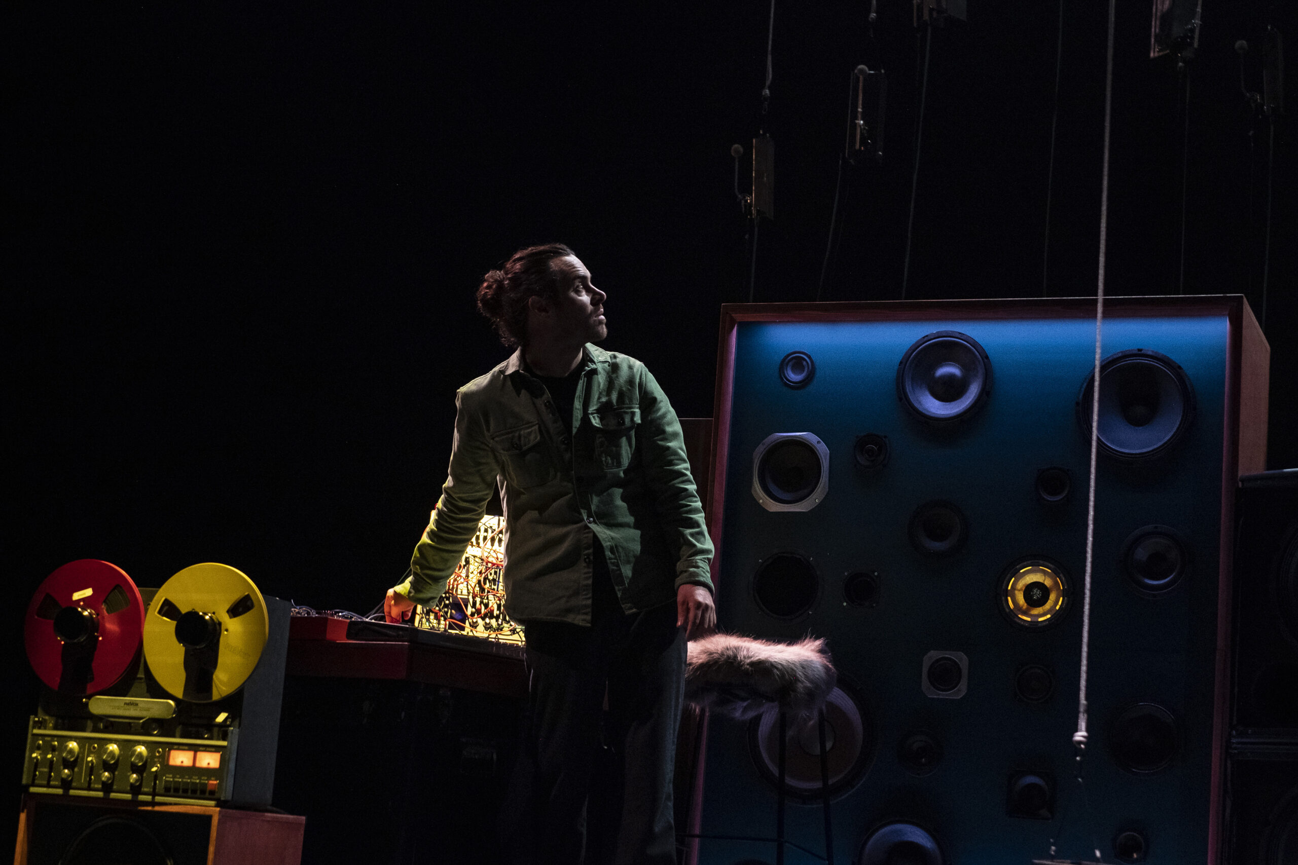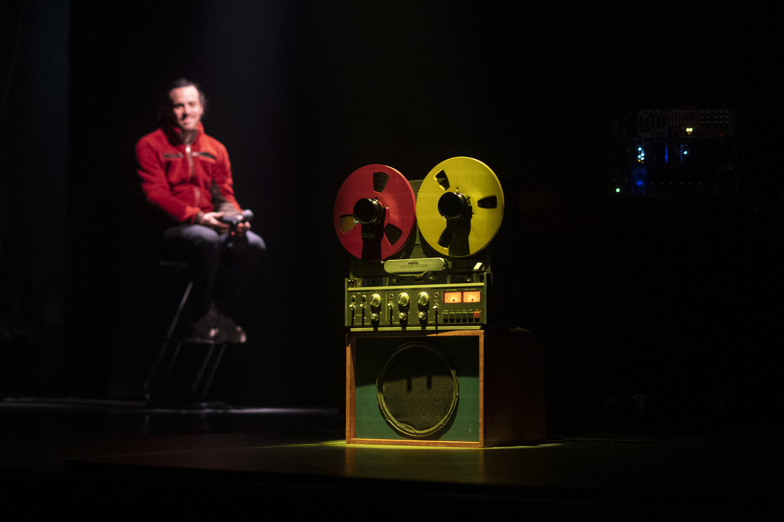 Seul sur scène, au coeur d’un mur de sons et de cloches automates, Christophe Le Menn va et vient entre son studio de musique et des contrées lointaines, bercé par les témoignages du magnétophone à bobines. Accompagné du compositeur et musicien Tom Leclerc en régie, aux manettes de différents instruments, Christophe Le Menn aka le rappeur Krismenn raconte, rappe, chante et manipule les sons du métallophone et l’électro du synthé modulaire.