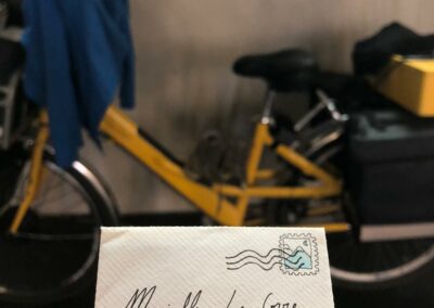 C’est un spectacle qui tourne à vélo. Un choix qui fait sens, de part le métier du personnage principal de la pièce : factrice à vélo; mais aussi qui est cohérent avec notre désir d’avoir une démarche artistique plus légère techniquement et plus vertueuse écologiquement.